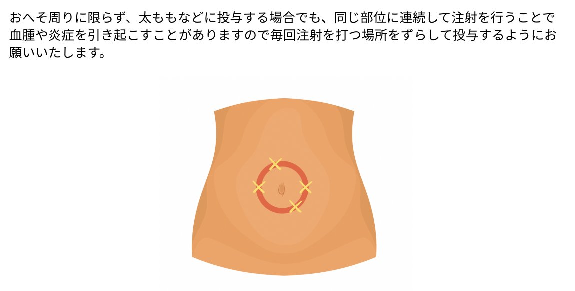 - 注射部位はお腹・太もも・上腕をローテーション。脂肪萎縮防止で毎回ずらす
